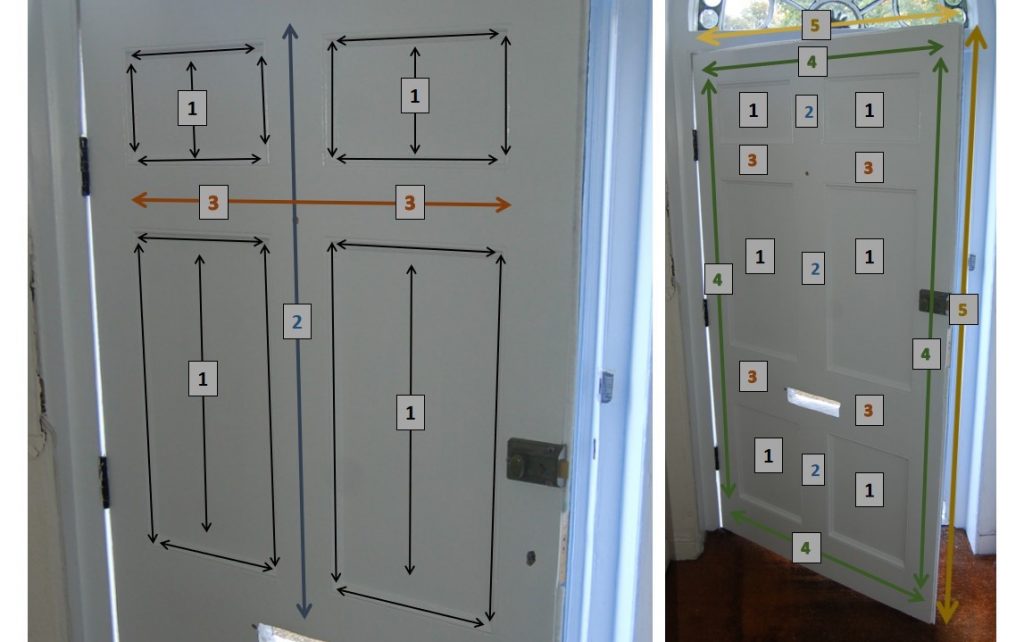 Painting the door can be very simple, however, for a more professional look, it is integral to follow the direction of the wood. Use the paintbrush for more intricate parts of the door, and then use a paint roller for flatter surfaces for efficiency. Follow the illustration below for the direction of the paint strokes. Start with panels, midsections, then sides. This would yield the best results. Wait for each coat to dry before applying the next, and wait until fully dried before moving to the next step.